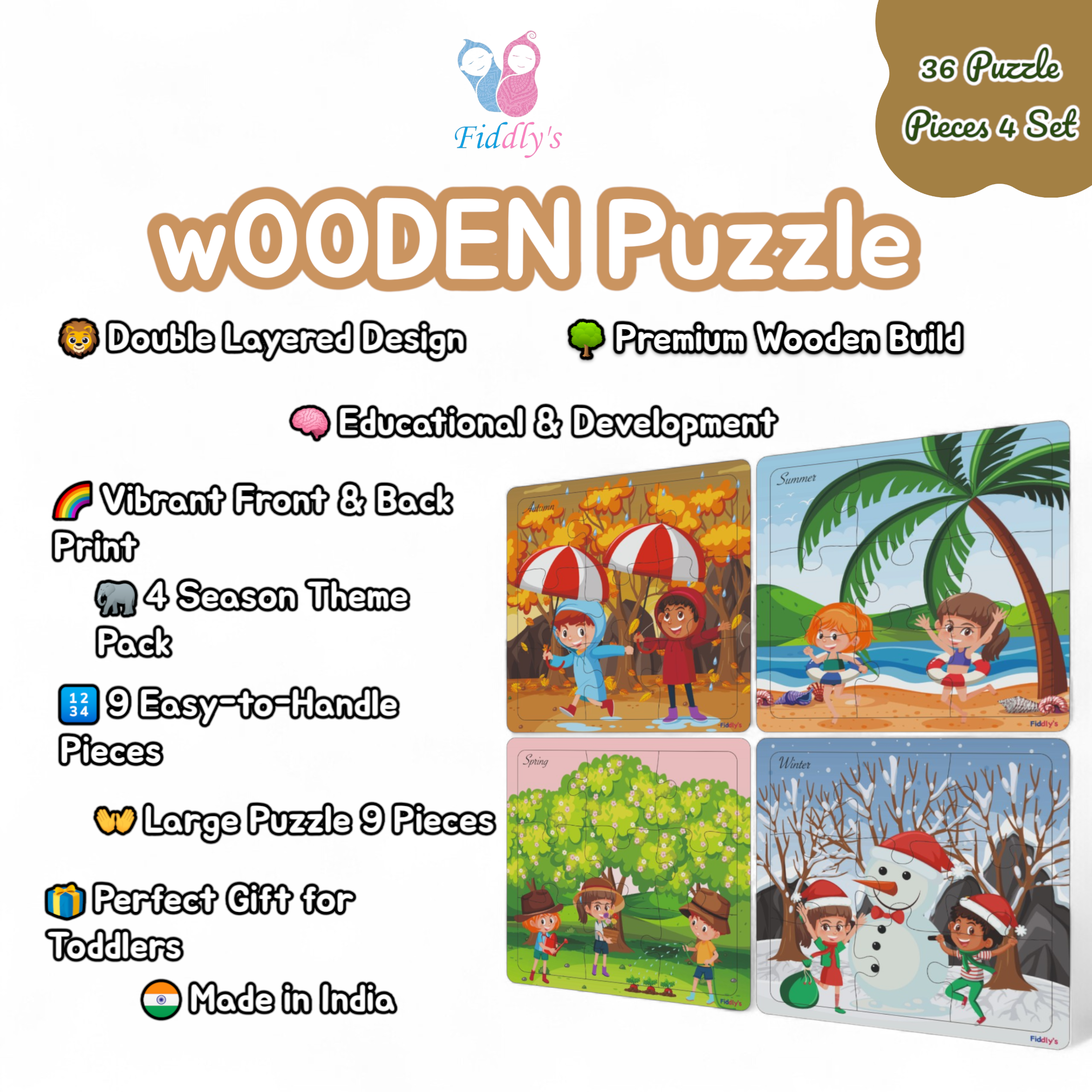 Step into the world of dinosaurs with Fiddlys Wooden Jigsaw Puzzles – Pack of 4 Season (9 pieces each)! Specially designed for kids age 3+, these puzzles feature exciting dinosaur designs that spark curiosity and imagination. Crafted from double-layered durable wood with bright front & back prints, they are built to last and provide double the fun. These puzzles are more than just toys – they encourage children to develop problem-solving ability, memory, focus, and motor skills while enjoying playtime. Perfect for early learning, gifting, or preschool activities.