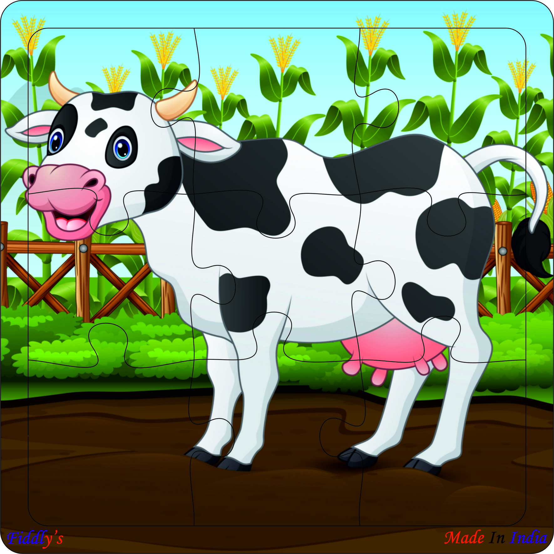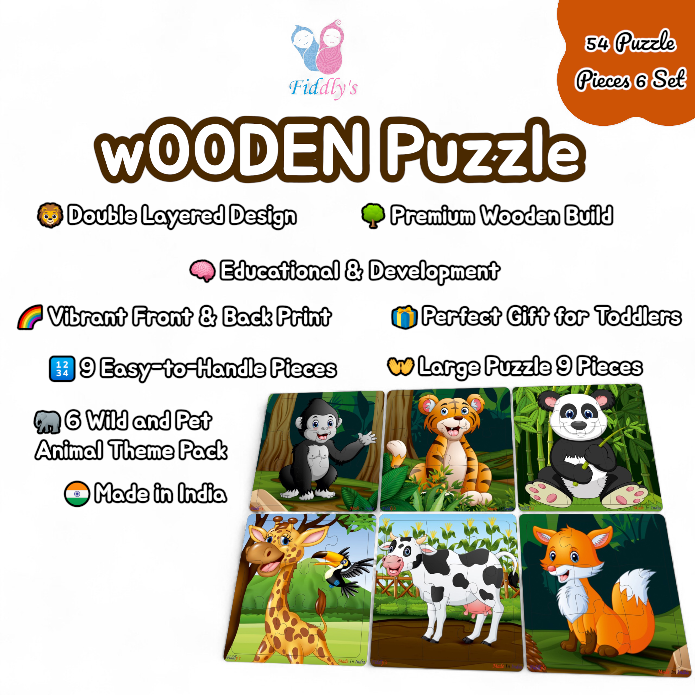 Fiddlys Wooden Jigsaw Puzzles are designed to make learning playful and interactive for kids. This Pack of 6 Animal Cow(9 pieces each) introduces little ones to different animals while building essential early skills. Each puzzle is made from double-layered durable wood with vivid, bright prints on both sides, ensuring extra value and long-lasting use. Ideal for boys & girls age 3+, these puzzles encourage problem-solving, hand-eye coordination, memory, and logical thinking, while keeping kids entertained. Safe, eco-friendly, and easy to handle, they are perfect for preschool learning, gifting, and everyday play.