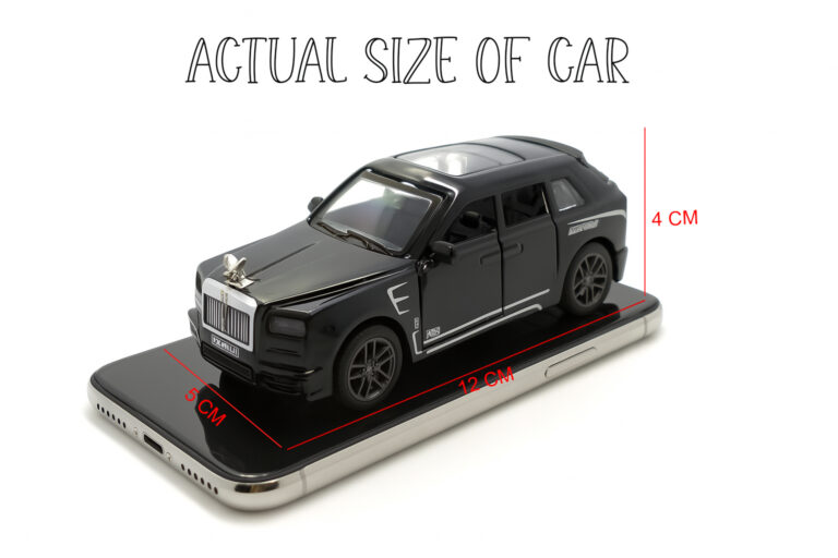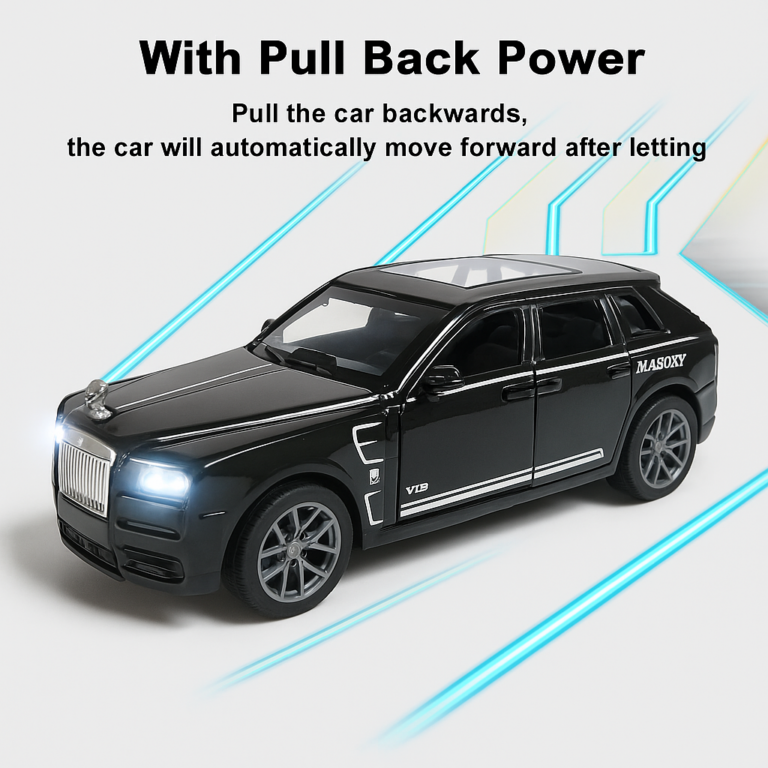Experience luxury and fun in one toy! The Flyers Bay 1:32 Scale Rolls-Royce Car Toy is crafted with a high-quality die-cast metal body, giving it a realistic and elegant look. Equipped with pull-back action, bright headlights, and musical sound effects, this model delights children and collectors alike. The openable doors and detailed interior add a touch of authenticity, making it a perfect collectible or play companion for kids aged 2 to 6 years. Designed to spark imagination, promote hand-eye coordination, and introduce kids to the world of premium cars.