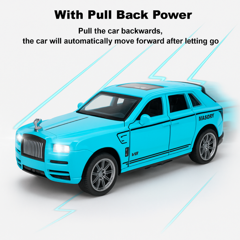 Experience luxury and fun in one toy! The Flyers Bay 1:32 Scale Rolls-Royce Car Toy is crafted with a high-quality die-cast metal body, giving it a realistic and elegant look. Equipped with pull-back action, bright headlights, and musical sound effects, this model delights children and collectors alike. The openable doors and detailed interior add a touch of authenticity, making it a perfect collectible or play companion for kids aged 2 to 6 years. Designed to spark imagination, promote hand-eye coordination, and introduce kids to the world of premium cars.