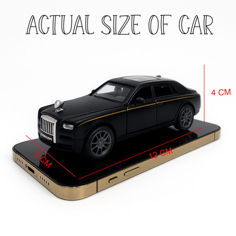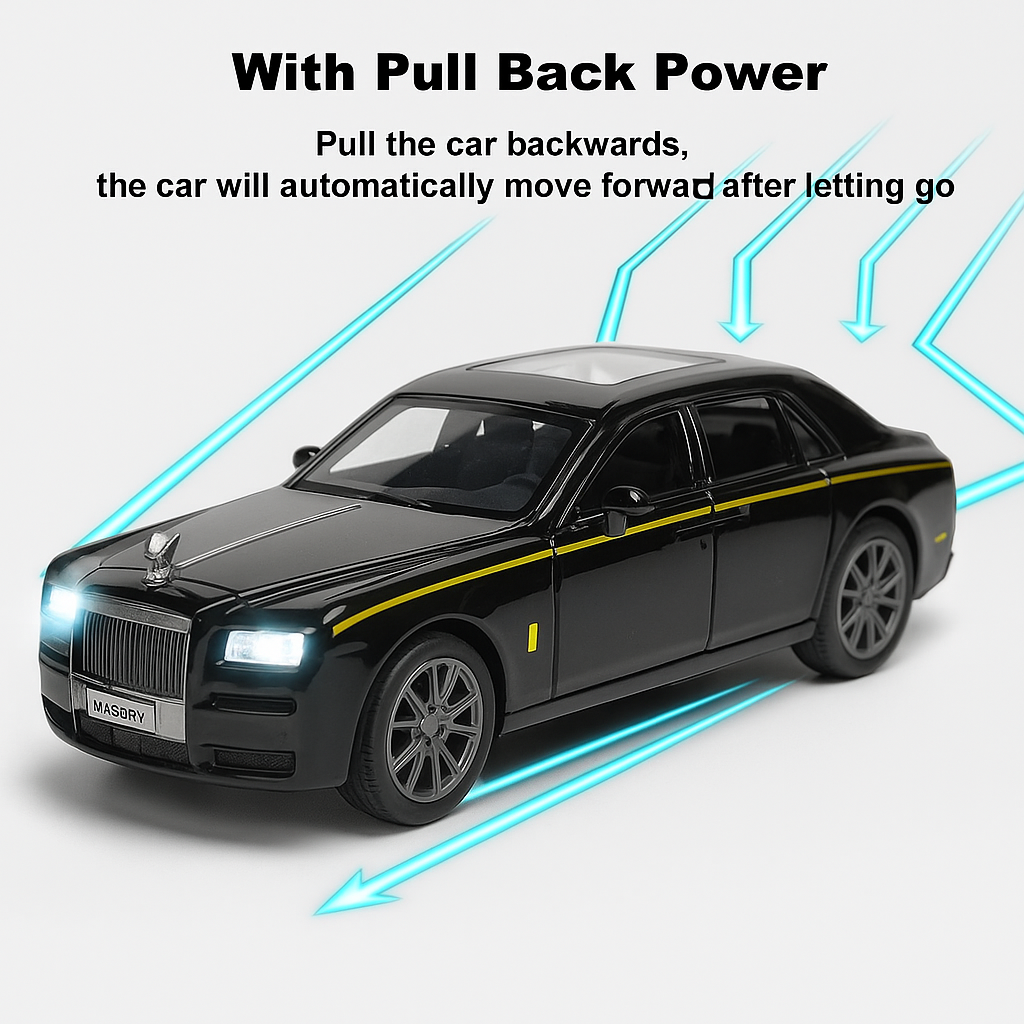 Experience luxury and fun in one toy! The Flyers Bay 1:32 Scale Rolls-Royce Car Toy is crafted with a high-quality die-cast metal body, giving it a realistic and elegant look. Equipped with pull-back action, bright headlights, and musical sound effects, this model delights children and collectors alike. The openable doors and detailed interior add a touch of authenticity, making it a perfect collectible or play companion for kids aged 2 to 6 years. Designed to spark imagination, promote hand-eye coordination, and introduce kids to the world of premium cars.