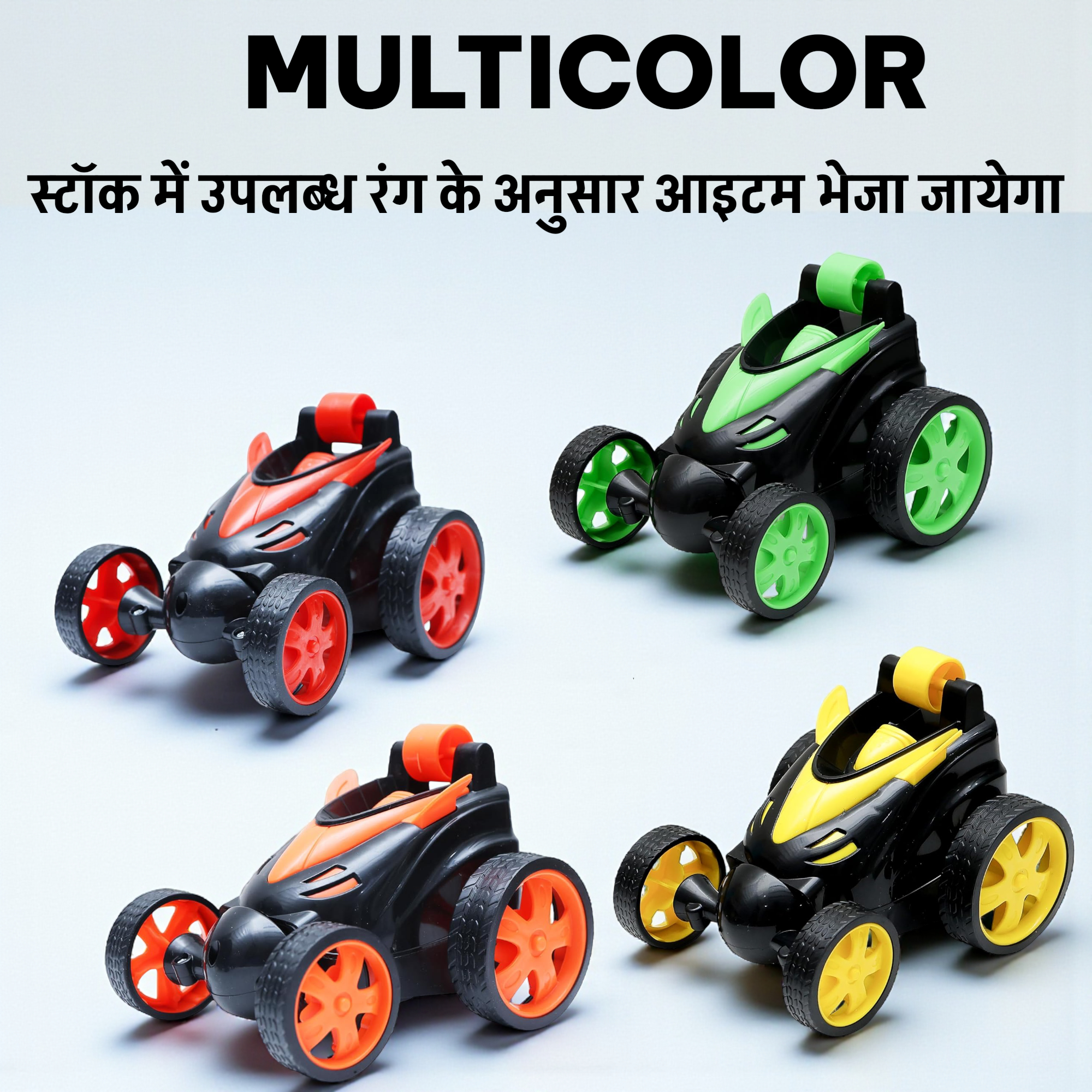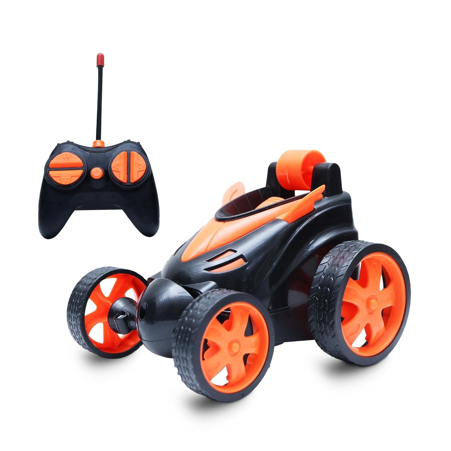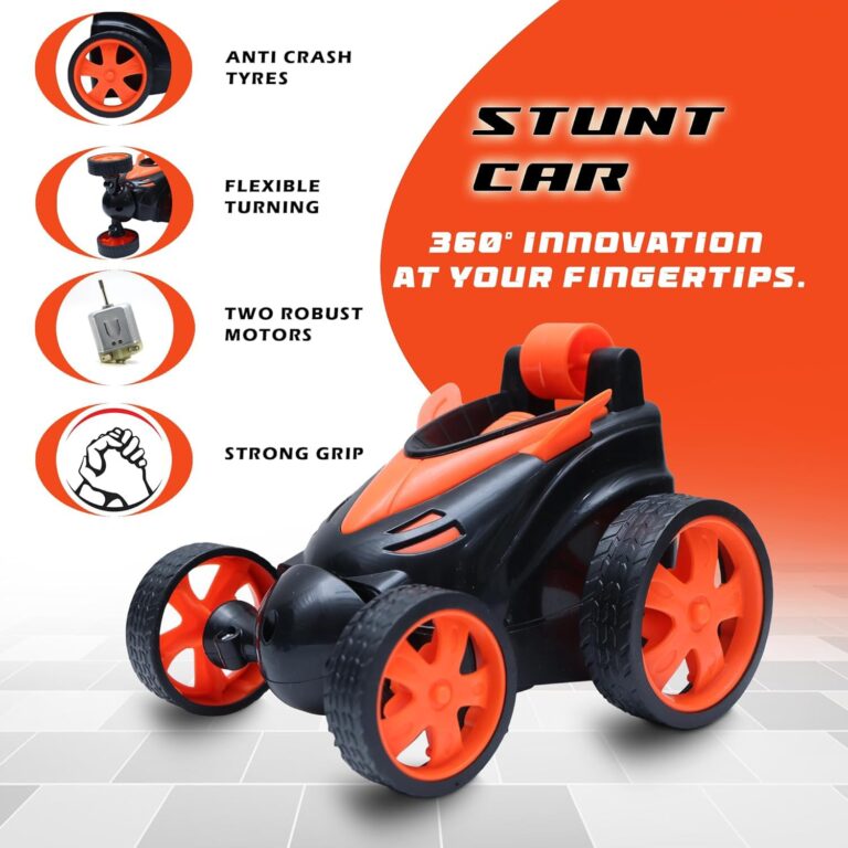 - RC STUNT CAR: This cool racing car can do all sorts of tricks. It can go forward, backward, left and right easily. It can even drive on its sides and spin around in a full circle (360°). When it’s moving fast, it can spin like a tornado and dance around. It can also walk upright at a 90-degree angle and do cool wheel spins and rolls in the front.